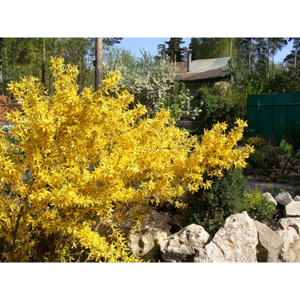 Форзиция - цветет раньше всех растений в марте, через неделю после того как сойдет снег. Кусты раскидистые, лист светло зеленый. Быстро растет. Саженец 3-х летний на 5-10 веток, высота 0,5-1,2 метра.